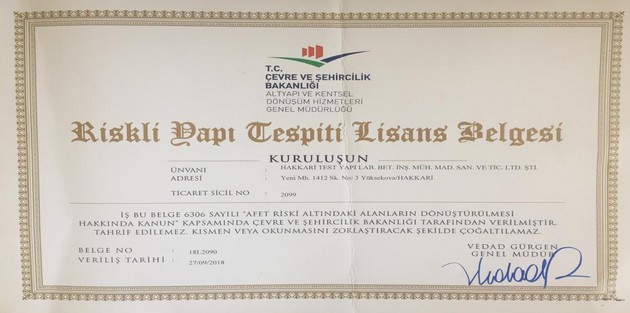 4 yıldır Hakkari ve ilçelerinde faaliyette olan Hakkari TEST Yapı Laboratuarı; Çevre ve Şehircilik Bakanlığı Altyapı ve Kentsel Dönüşüm Hizmetleri Genel Müdürlüğü'nce 6306 Sayılı "Afet Riski Altındaki Alanların Dönüştürülmesi Hakkında Kanun" kapsamında verilen "Riskli Yapı Tespiti Lisans Belgesi"ni aldı.
