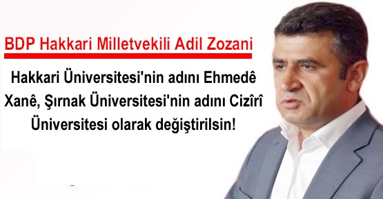 Zozani, meclise sunduğu kanun teklifinde Hakkari Üniversitesi'nin adının Ehmedê Xanê Üniversitesi, Şırnak Üniversitesi'nin adının da Cizîrî Üniversitesi olarak değiştirilmesini talep etti.