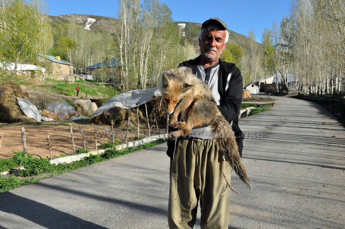 Yüksekova ilçesine bağlı Gürdere köyüne inen ve arıların saldırısına uğrayan tilkiyi muhtar korumaya aldı.