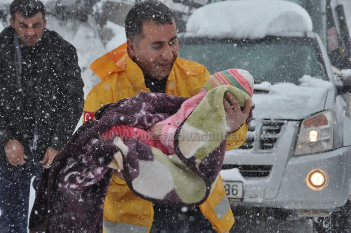 İlçe merkezine yaklaşık 14 kilometre mesafede bulunan ve yolu kar nedeniyle kapalı olan Kadı köyünde yaşayan Eylül (4) ve Ayvaz (5) Fidan kardeşlerin aniden ateşi yükseldi. Haber verilmesi üzerine hemen harekete geçen 112 Acil Servis ekipleri, kardan dolayı kapalı olan ve yoğun tipi altında olan yolu geçemeyince Yüksekova Özel idaresi ekibinden destek istedi. Bölgeye gelen ekipler, yolu açıp hasta kardeşlere ulaşmak için çalışma başlattı.