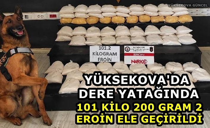 Yüksekova ilçesinde, bir ihbarı değerlendiren polis ekipleri; ilçe merkezine yakın dere yatağında, narkotik köpek 'Tipi' ile yapılan aramada 101 kilo 200 gram eroin ele geçirdi, 1 şüpheli gözaltına alındı.