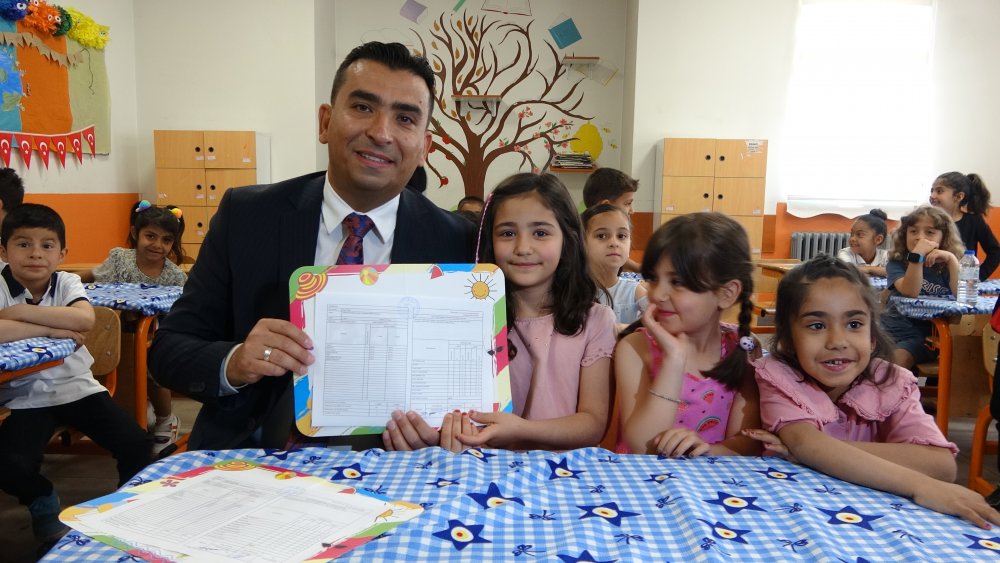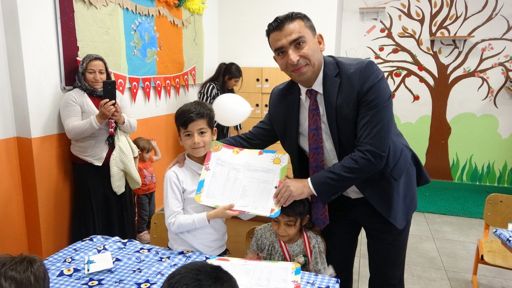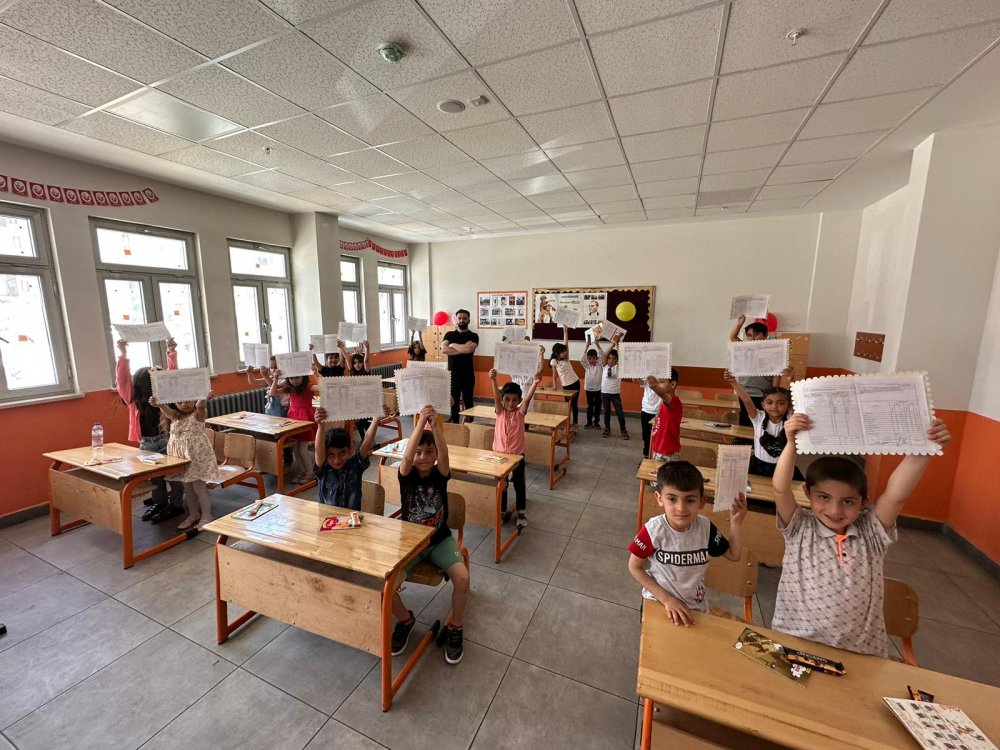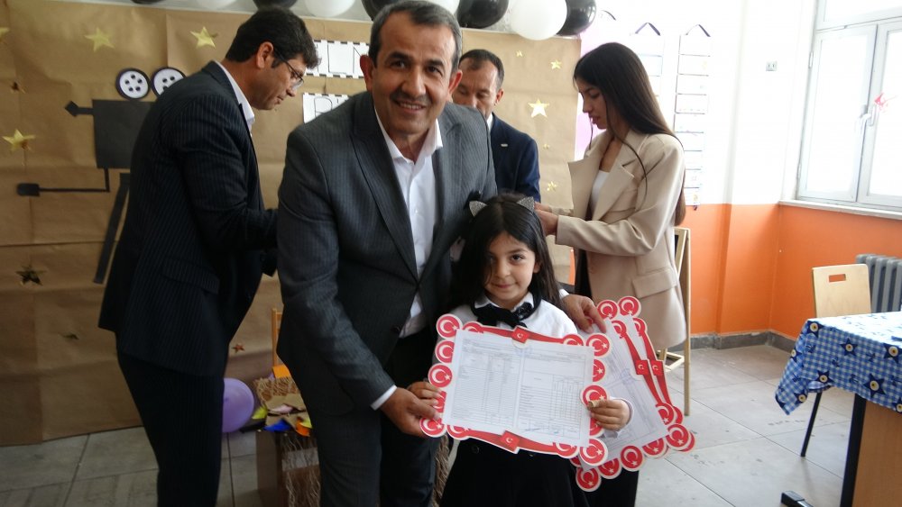 Sınıfları gezerek öğrencilerle sohbet eden Yüksekova Milli Eğitim Müdürü Yusuf Atael, ardından karnelerini dağıttı.