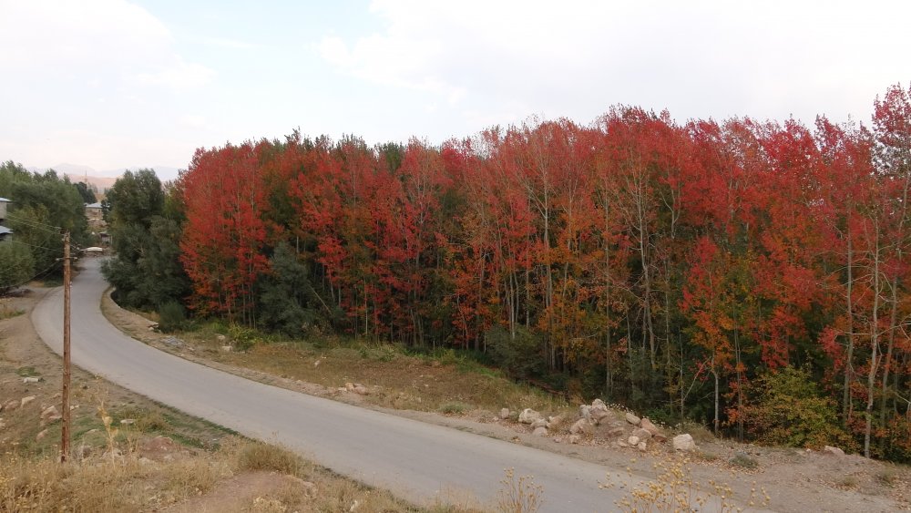 Yüksekova ilçesinde sonbaharla beraber kırmızı rengine bürünen ağaçlar güzelliğiyle mest ediyor.