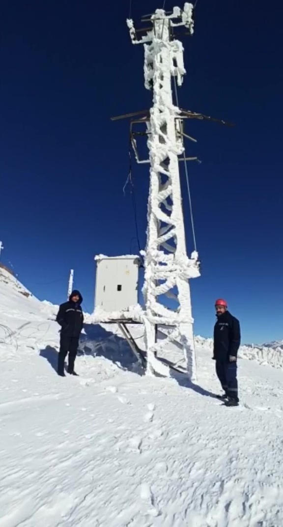 Yüksek kesimlerde buz tutan elektrik direkleri şaşırtırken üzerine çıkan ekipler, vatandaşın mağdur olmaması için zorlu şartlarda çalışmalarını sürdürüyor.