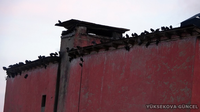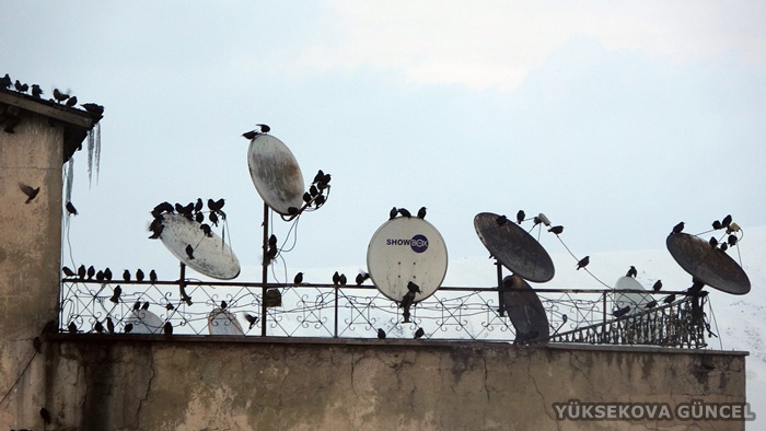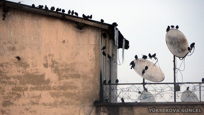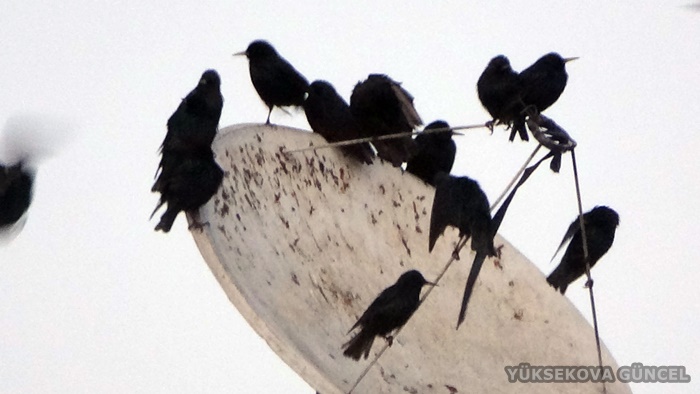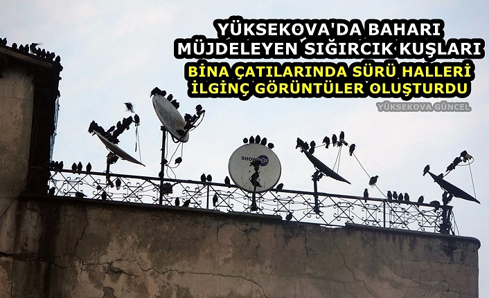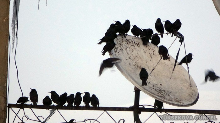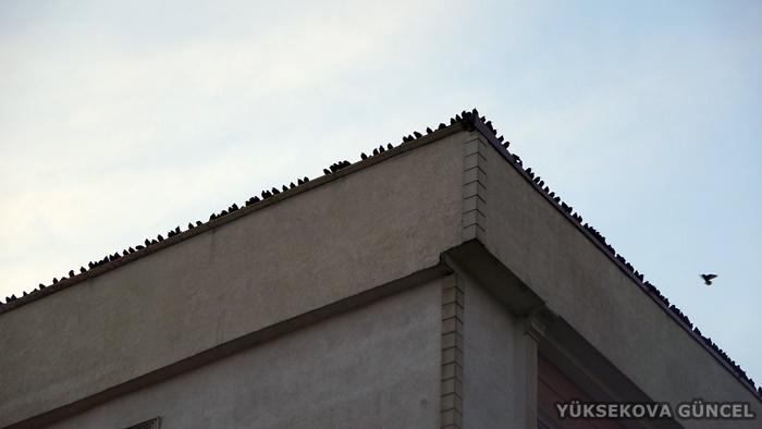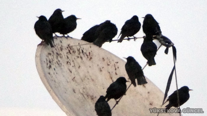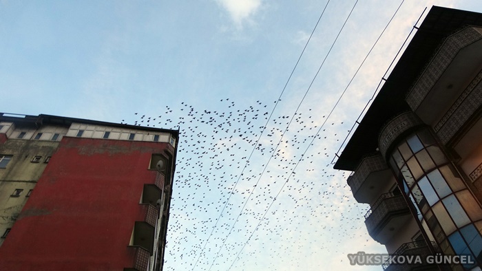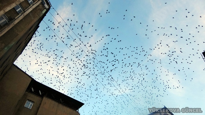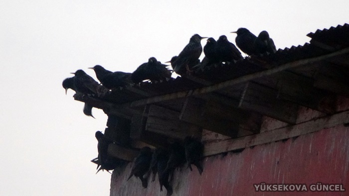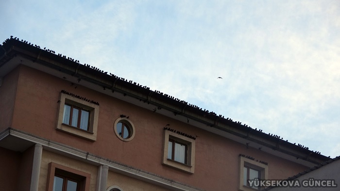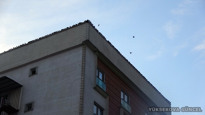 Yüksekova ilçesinde binaların çatılarına sürü halinde konan sığırcık kuşları ilginç görüntüler oluşturdu.