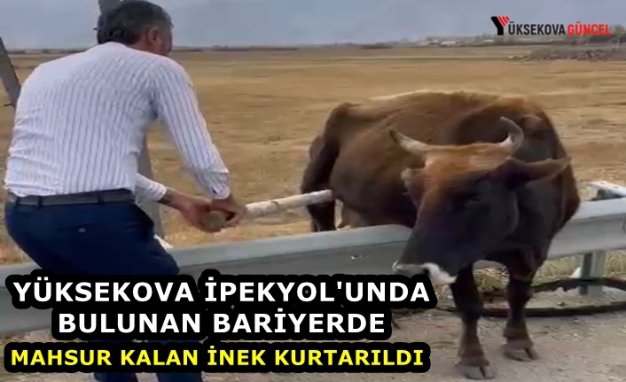 Yüksekova ilçesindeki kara yolu kenarındaki güvenlik bariyerinden geçerken mahsur kalan ineği vatandaşlar kurtardı.