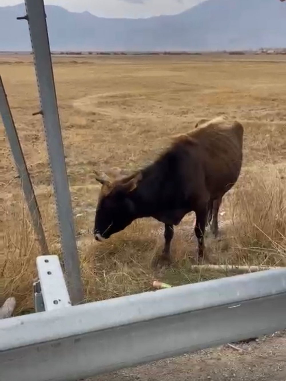 Otlandıktan sonra yolun karşısına geçerken üzerinden atladığı güvenlik bariyerinde mahsur kalan inek için çevredeki vatandaşlar hemen kurtarmak çalışması başlattı.