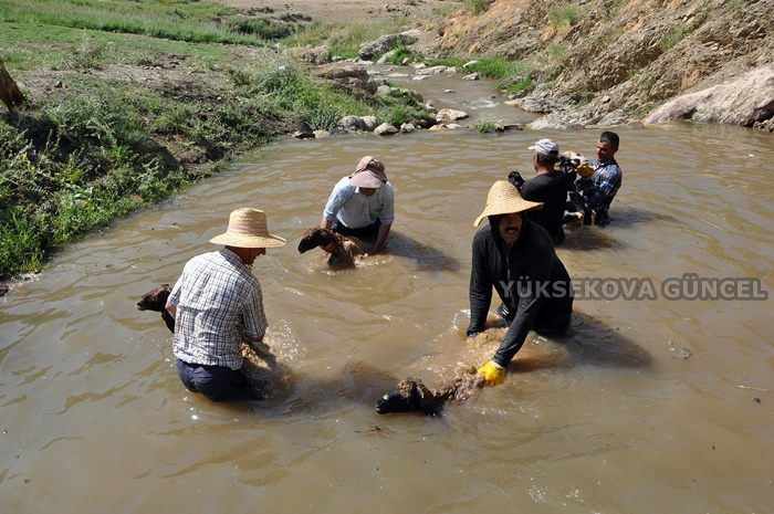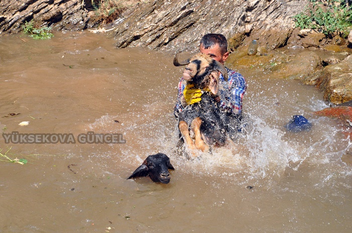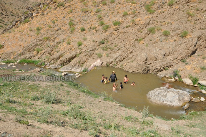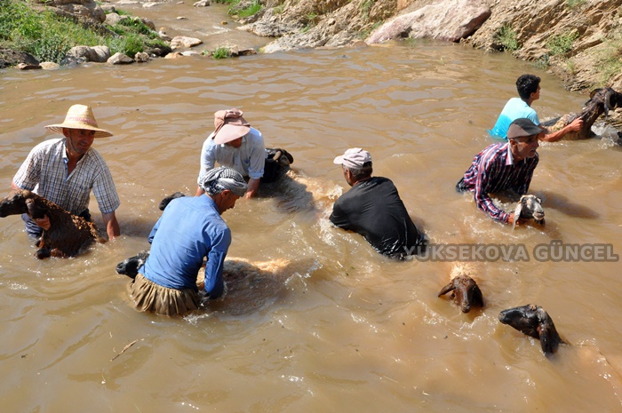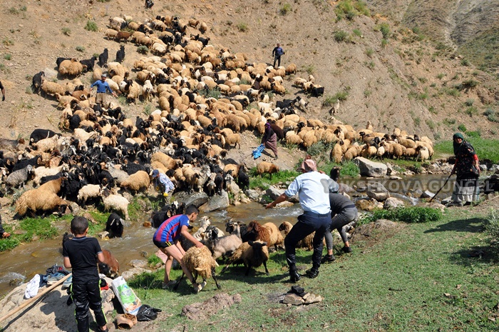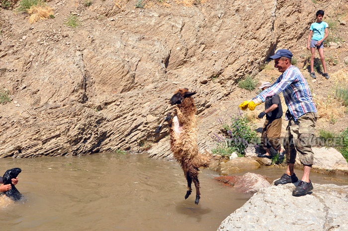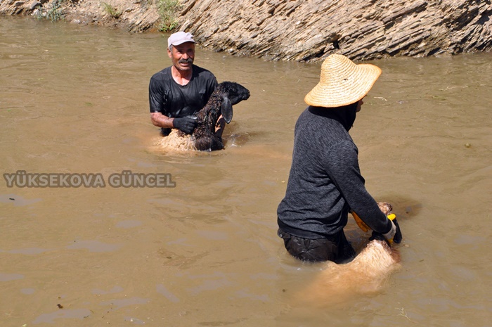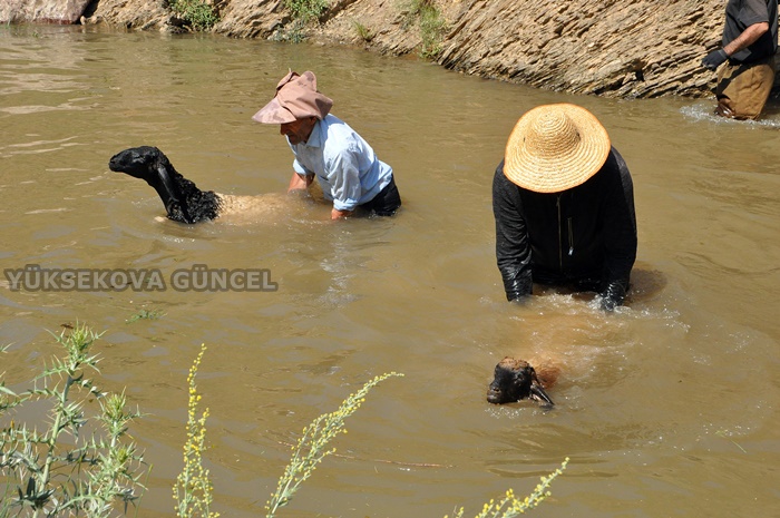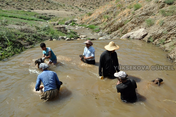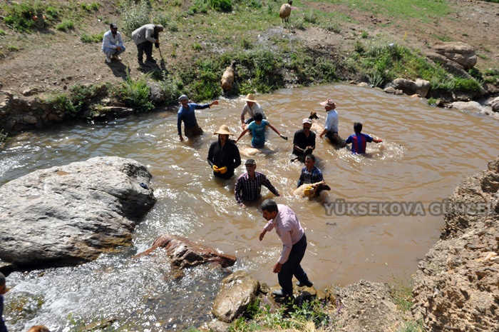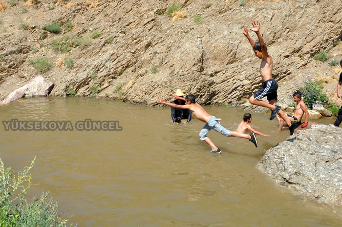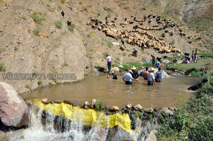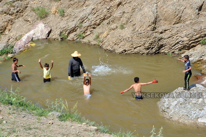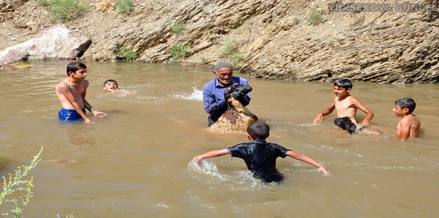Yüksekova ilçesine 30 kilometre uzaklıkta bulunan Beşpınar Yaylası'nda kırkma öncesi koyunların yıkandığı gölette çocuklar da yüzerek serinliyor.