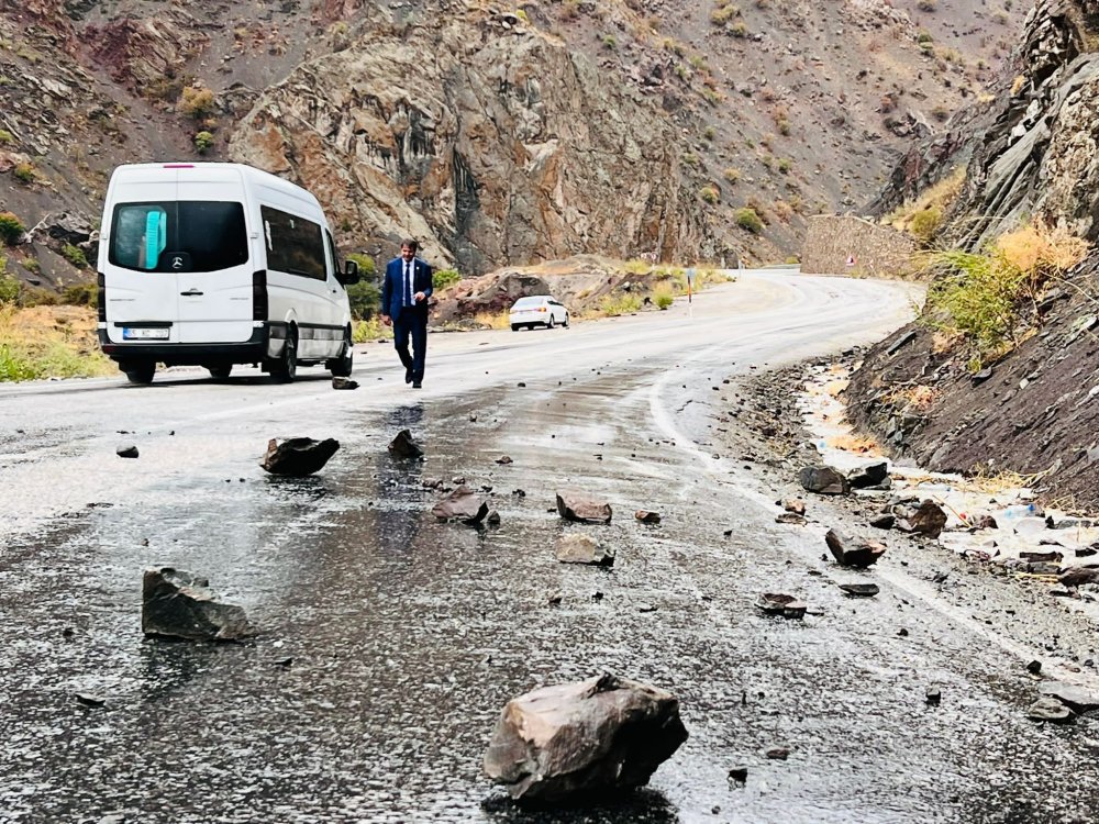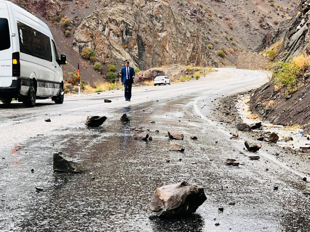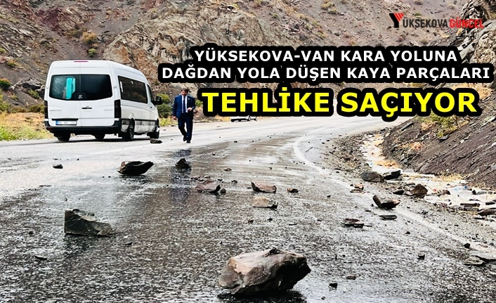 Yağışlardan dolayı zeminin yumuşaması sonucu Yüksekova-Van kara yoluna Yeni Köprü bölgesinde kaya parçaları düştü.