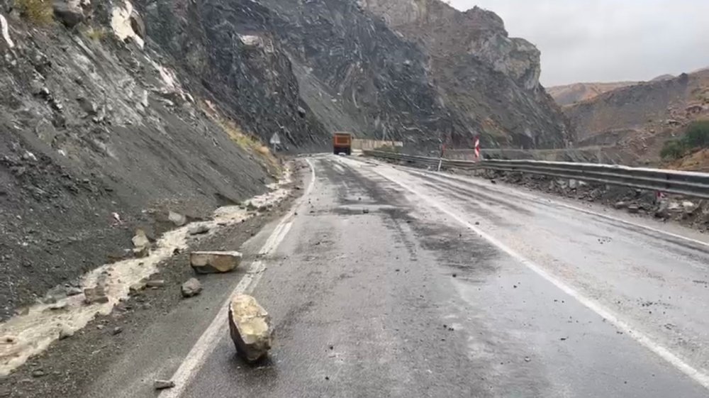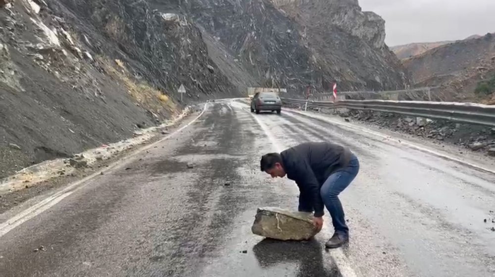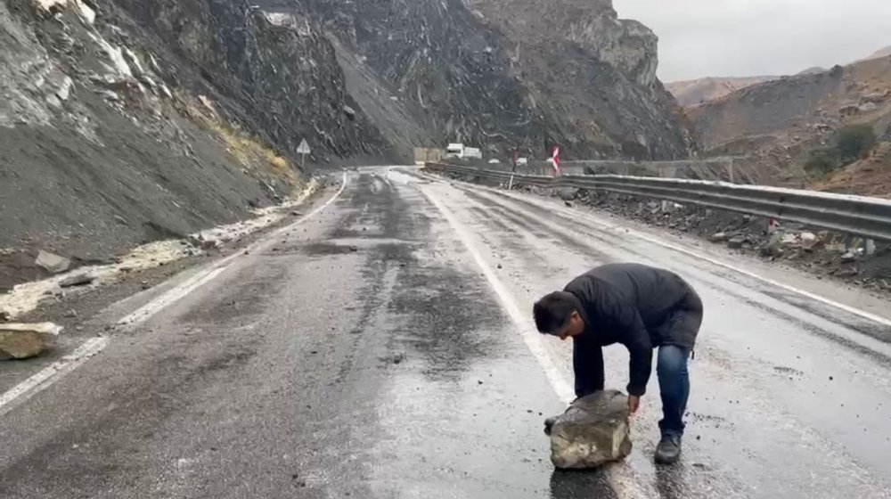 Yüksekova ilçesinde yoğun yağışlardan dolayı zeminin yumuşaması sonucu kara yoluna kaya düştü.