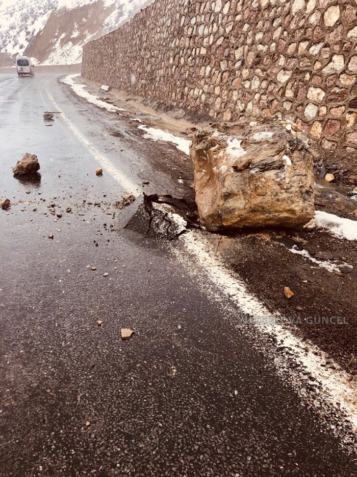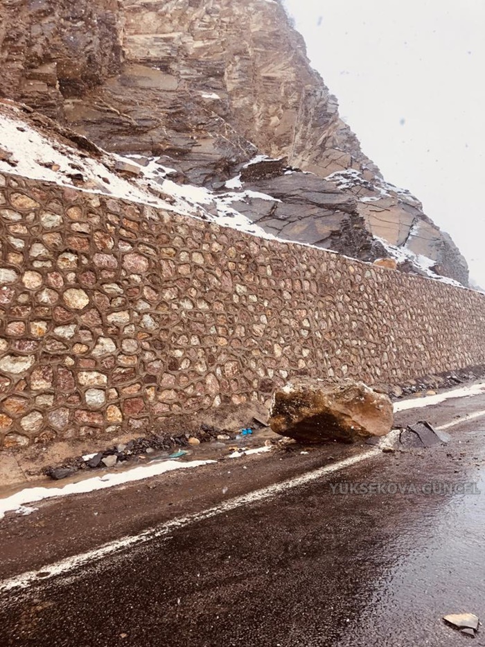 Yüksekova ilçesinde karayoluna dev kaya parçaları düşerken, şans eseri ölen ya da yaralanan olmadı.