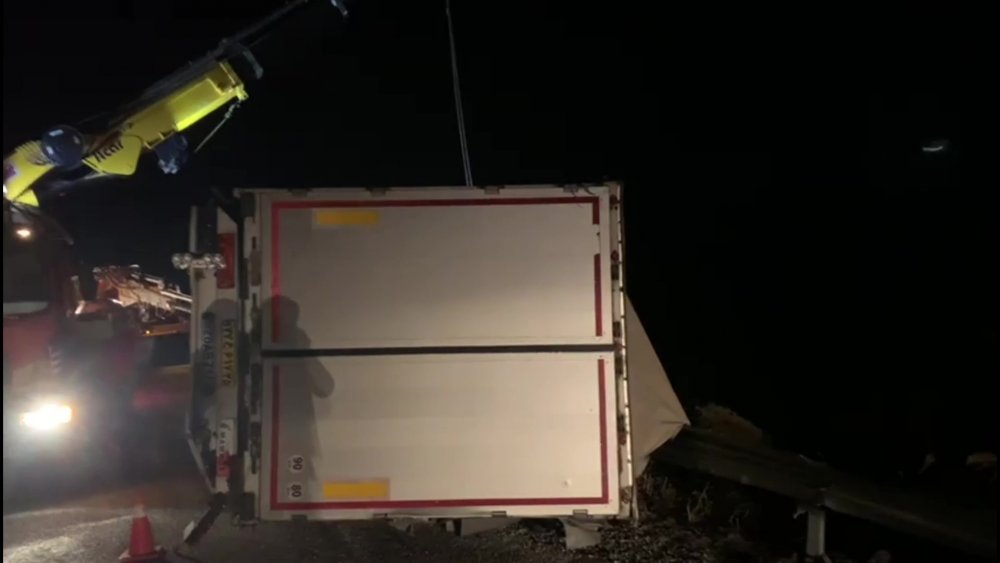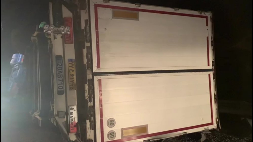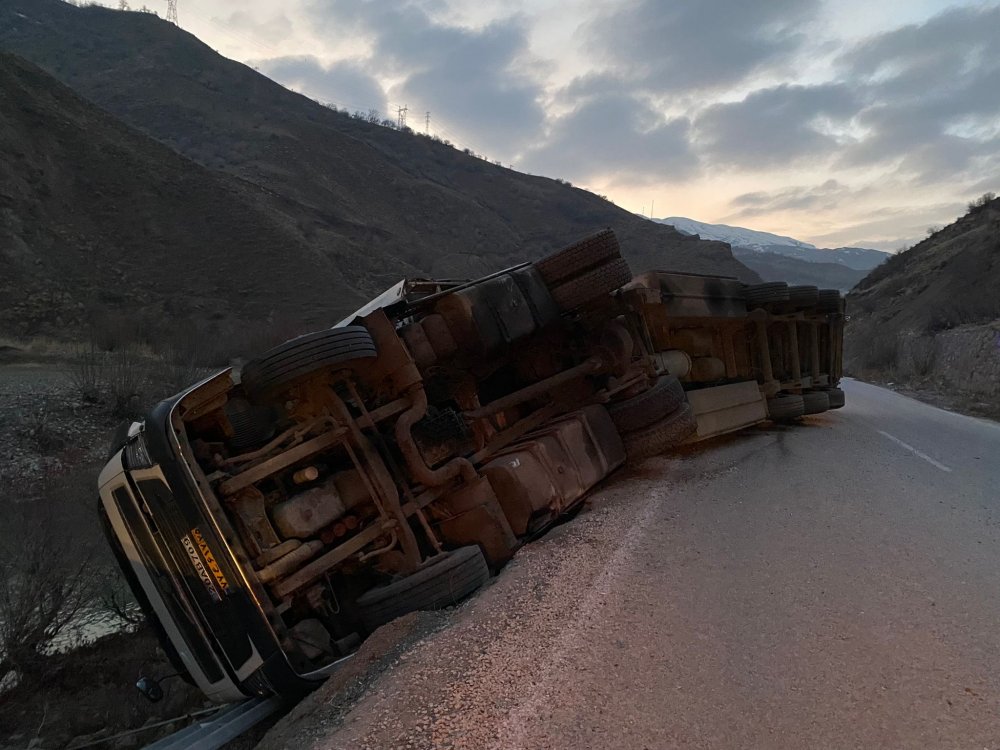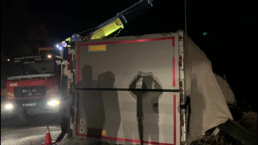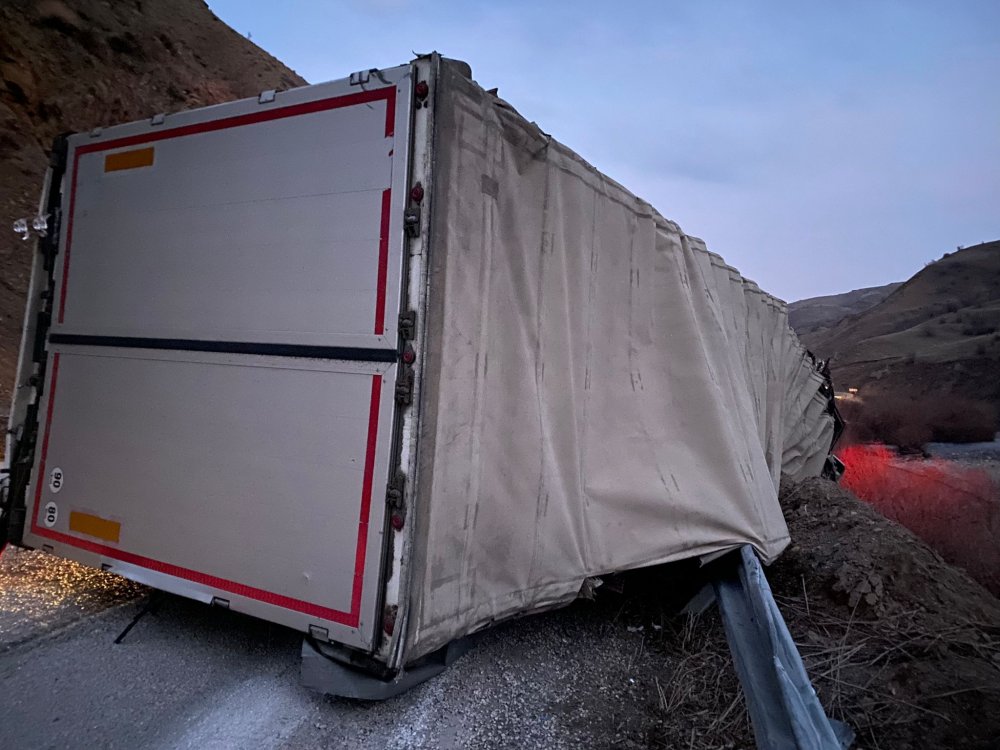Sürücüsünün ismi öğrenilemeyen İran plakalı tır, ülkesine gitmek isterken sürücünün direksiyon hakimiyetini kaybetmesi sonucu yoldan çıkarak devrildi.