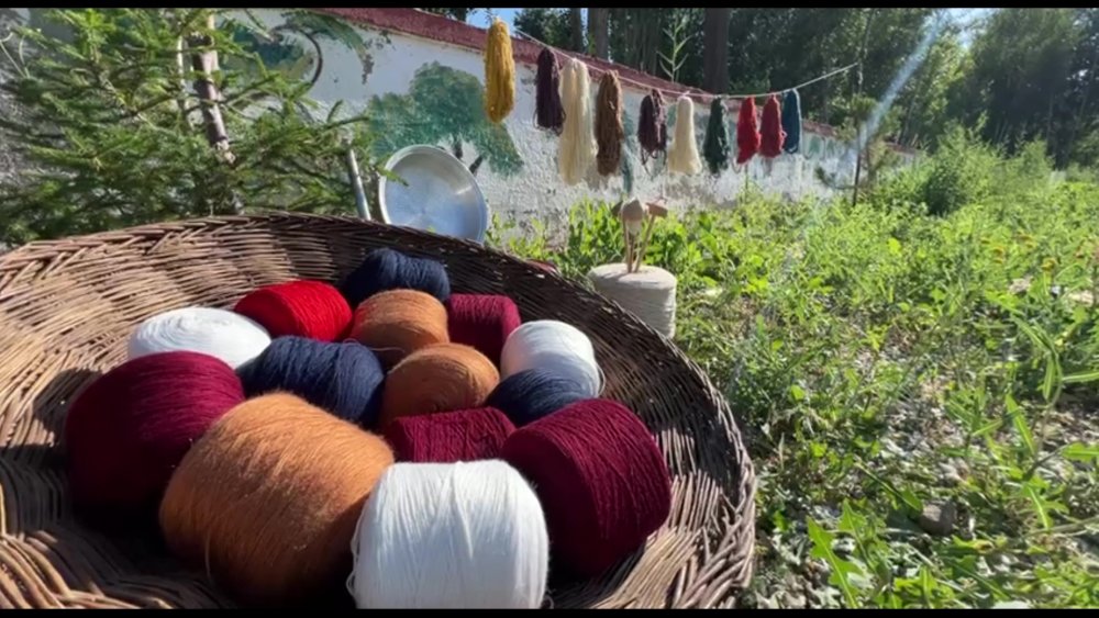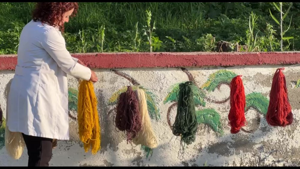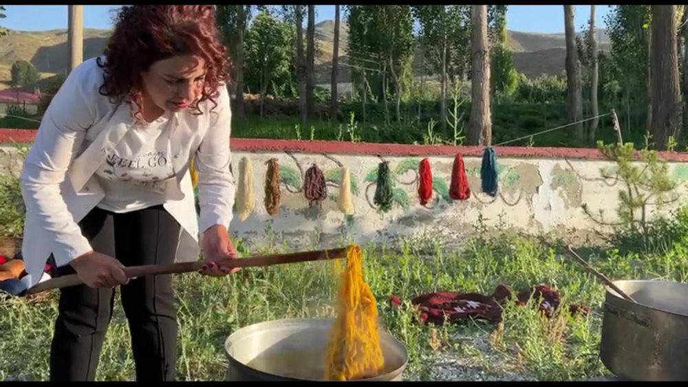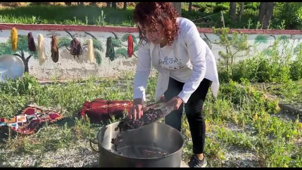 Halk Eğitim Merkezinde usta öğretici olarak görev yapan Arife Gemicioğlu tarafından yünlerin farklı işlemlerden geçirerek boyaması yapılıyor.