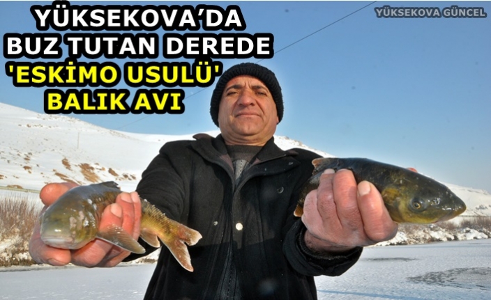 Yüksekova ilçesinde yaşayan vatandaşlar kış aylarında buzla kaplı derelerde, soğuk havaya ve tehlikelere aldırmadan 'Eskimo Usulü' balık avlayarak ailelerinin geçimini sağlarken, bazıları da hobi olarak balık tuttuklarını belirttiler.