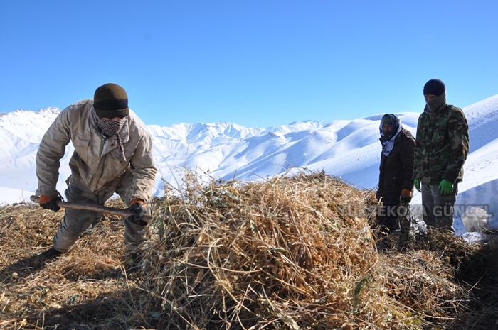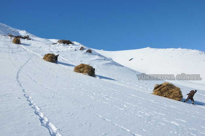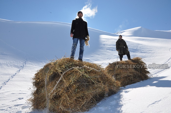 Karın yağmasıyla 2 bin rakımlı dağlarda biriktirdikleri ot yığınlarını almak için harekete geçen köylüler, kürek ve naylon brandalarını omuzlarına alarak yola koyuluyorlar. Kar kalınlığının yer yer 3 metreyi aştığı bölgede ilerleyen köylüler, hayvanlarını beslemek için dondurucu soğuklara aldırış etmiyor.