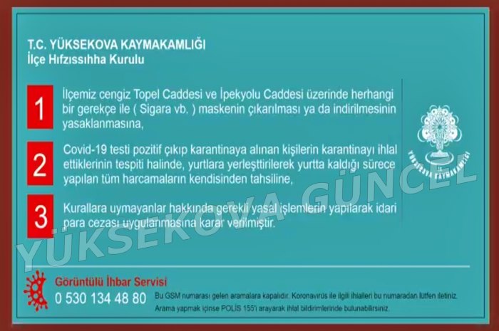 İlçe'de Vefat ve vakaların artmasından dolayı, ilçe Hıfzıssıhha kurulunun verdiği kararla, Topel Caddesi ve İpekyolu caddesi üzerinde sigara içmek maksadıyla maske çıkartmak ve karantinayı bozanlara Covit-19 mücadelede 'Görüntülü İhbar Hattı' açıldı.