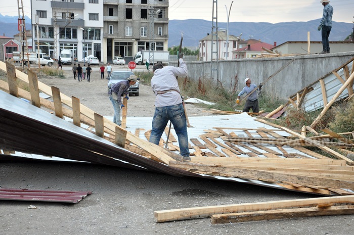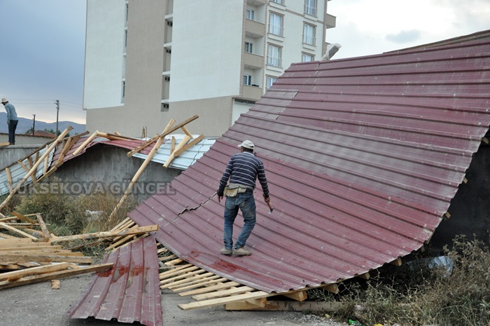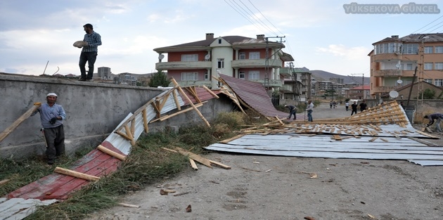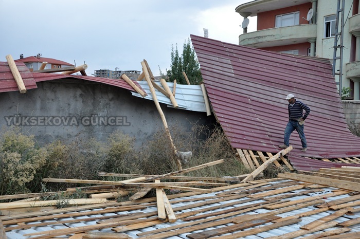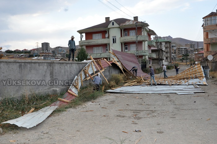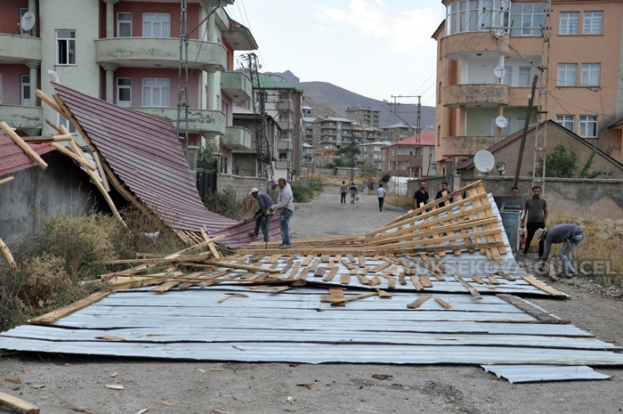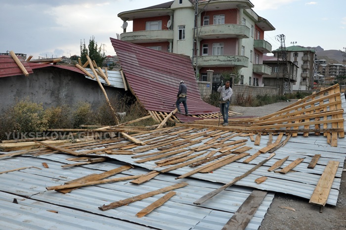 Yüksekova ilçesinde etkili olan fırtına iş yerinin çatısını uçurdu.
