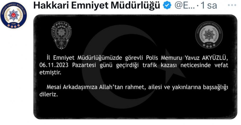Yapılan açıklamada, “Polis memuru Akyüzlü'nün kazada hayatını kaybettiğini. Mesai arkadaşımıza Allah'tan rahmet, ailesi ve yakınlarına başsağlığı dileriz” İfadeleri kullanıldı.