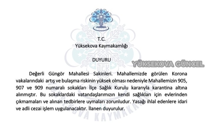 Paylaşımda, "Değerli Güngör Mahallesi sakinleri, mahallemizde görülen koruna vakalarındaki artış ve bulaşma riskini yüksek olması nedeniyle mahallemizin 905, 907 ve 909 numaralı sokakların ilçe sağlık kurulu kararıyla karantina altına alınmıştır. Bu sokaklardaki vatandaşlarımızın kendi sağlıkları için evlerinden çıkmamaları ve alınan tedbirlere uymaları zorunludur. Yasağı ihlal edenlere idari ve adli cezai işlem uygulanacaktır İlanen duyurulur" denildi.