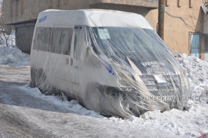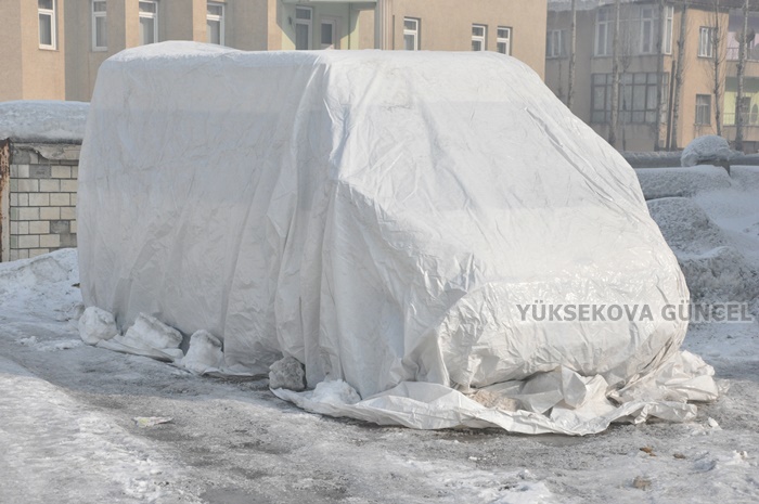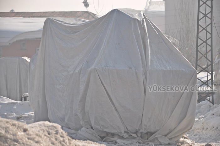 Bazı evlerin kara gömüldüğü ilçede, araçlar ise soğuk havaya karşı brandayla korunuyor.