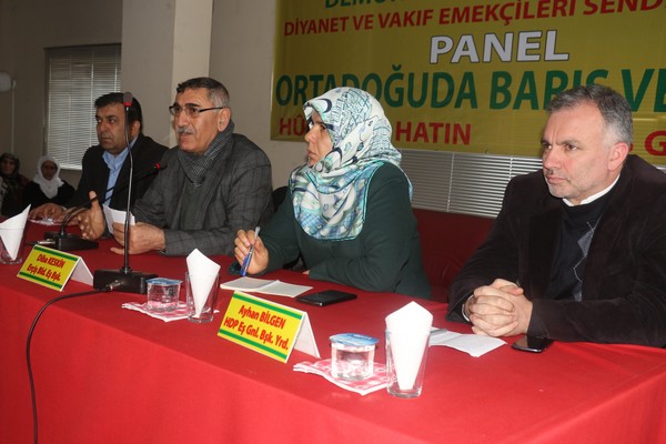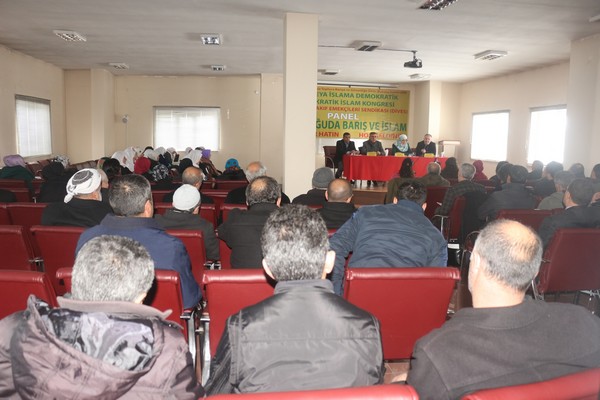 Hakkari'nin Yüksekova ilçesinde Avaşin Parkı’nda bulunan konferans salonunda Demokratik İslam Kongresi ve DİVES tarafından "Ortadoğu'da İslam ve Barış" konulu bir panel düzenlendi. Moderatörlüğünü İl Genel Meclis Başkanı Lokman Özdemir’in yaptığı panelde, HDP Eş Genel Başkan Yardımcısı Ayhan Bilgen, DTK Diyalog ve İkna Komisyon Üyesi Dr. Fadıl Bedirhanoğlu ve Erciş Belediye Eş Başkanı Diba Keskin konuşmacı olarak yer aldı.