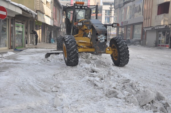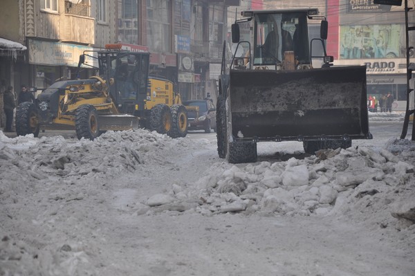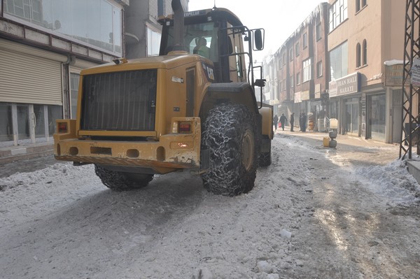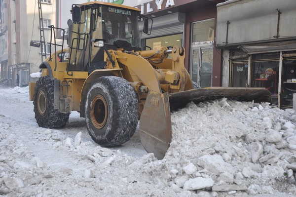 Cengiz Topel Caddesini trafiğe kapatarak iş makineleriyle kar temizliği yapan ekipler, iş makinelerinin giremediği yerleri ise küreklerle temizledi. Toplanan karlar kamyonlarla ilçe dışına taşındı.
