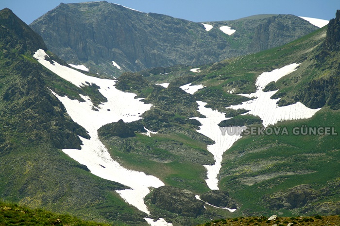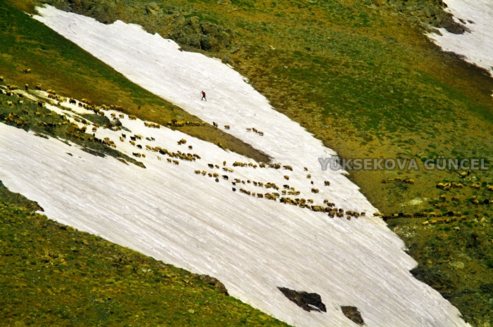 Yüksekova ilçesindeki Mergezer Yaylası'ndaki kar kütlelerinin yeşillikle bütünleşmesi, görenleri kendisine hayran bırakıyor.