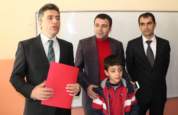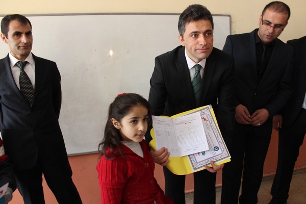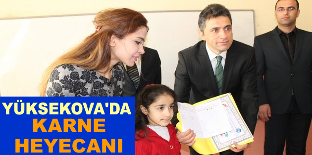 Yüksekova'daki 50. Yıl İlk ve Ortaokulu'nda düzenlenen törene katılan İlçe Kaymakamı İbrahim Çenet ve Milli Eğitim Müdürü Necmettin Kaya, öğrencilere karnelerini dağıttı.