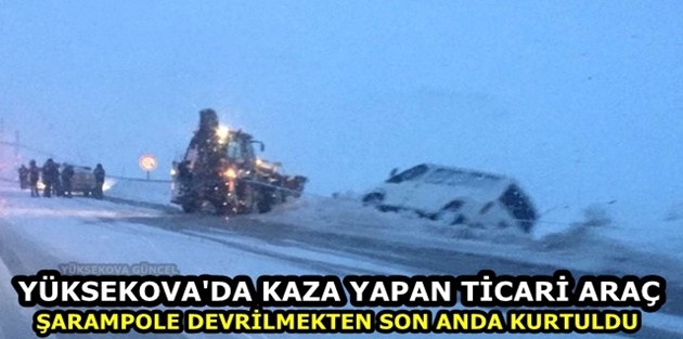 Yüksekova ilçesinde otomobil ile çarpışan ticari araç şarampole devrilmekten son anda kurtuldu. Kazada yaralanan olmazken, araçlarda hasar meydana geldi. Edinilen bilgilere göre kaza, devlet hastanesinin yanında bulunan polis noktası yakınlarında meydana geldi. Sürücüleri kimliği öğrenilemeyen bir ticari araç ile otomobil çarpıştı.