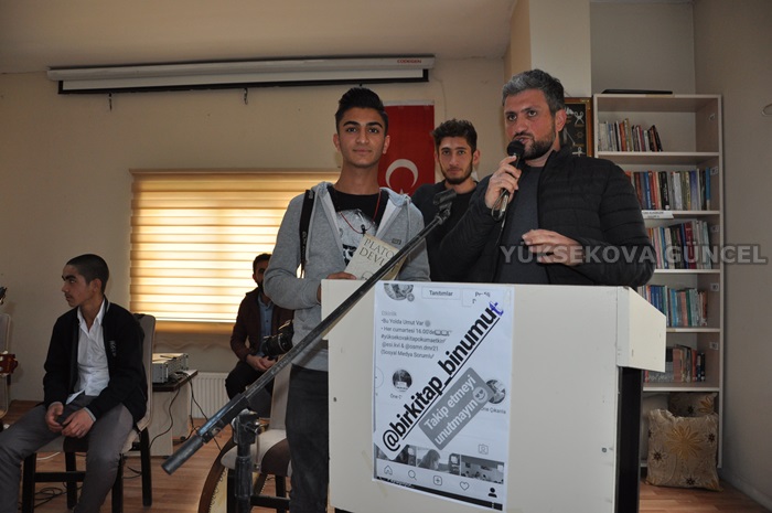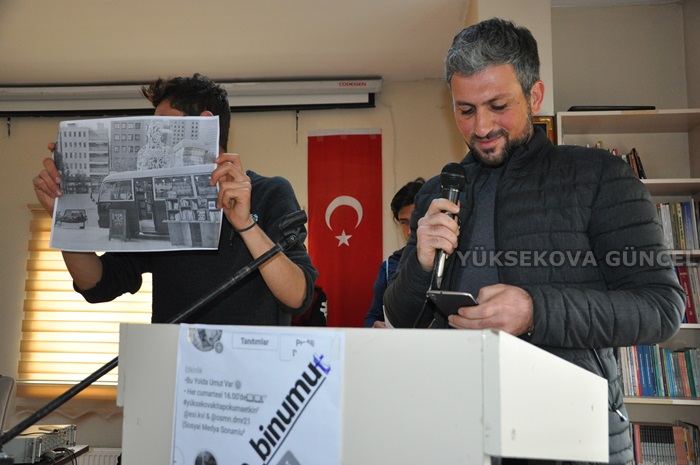 Bu yol da umut var Projesi Gönüllüleri ve okuyucuları da Davetliler arasında yer aldılar.Etkinlikte proje koordinatörü Osman Demir bir konuşma yaparak;Biz bu projeyi yaklaşık 3 4 aydır Yüksekova'da başlattık.Teknoloji hızla ilerliyor insanlar bu hıza ulaşalım derken kitap okumayı çok azalttı. Türkiye'de şuan günde kişi başına okumaya ayrılan süre bir dakika Yüksekova'da da durum pek farklı değil. Biz bu noktada burda "Bu Yolda Umut Var" adı altında böyle bir proje başlattık. Yüksekova da okuma alanları az olduğu icin kitabus fikrini gerçekleştirmek ve Yüksekova halkına kazandırmak istiyoruz. Biz proje arkadaşlarımız okuyoruz ve Yüksekova halkına da okutmak istiyoruz diyen Demir,daha sonrasında sorduğu iki soruya cevap veren iki şanslı okucuya kitap hediye etti.