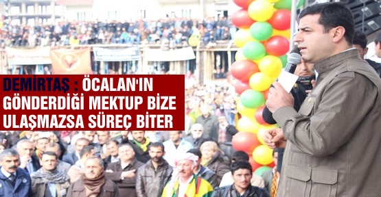 Demirtaş,"Kürt halkı üzerine düşen ne varsa fazlasıyla yerine getird.Ateşkes, geri çekilmesve huzur ortamının yaratılması , diyaloğun başlatılması bütün bunlar hepsi gerçekleşti.Ama bu bir yıl boyunc AKP hükümeti üzerine düşeni yapmadı.Hasta tutsaklar konusunda bile hükümet terüddüt etti.Şu ana hükümet sayın Öcalan'ın mektubunu bile iletmedi.Diyarbakır Nevruzuna iki gün kala hala bu mektubun gelinmemiş olması biz de kaygı uyandırıyor.Hükümet bu yaklaşımla , bu tutumyla süreci yönetemez.Bu mektubun derhal bize ulaşması lazım.Çünkü son görüşmede BDP, HDP heyetine sayın Öcalan bir mektup vereceğini, o mektubun Diyarbakır Nevruzunda okunacağını ifade etmişti. Ama bu sabaha kadar bu mektup bize teslim edilmiş değil.Bu mektubun ulaşmaması bu sürecin başka boyuta geçmesi demektir. Böyle bur tutumu asla kabul edemeyiz.Barış için İmralı'daki hücresinde mücadele eden ,fedakarlık yapan,bu konuda barış için herşelini feda etmeye hazır olduğunu ilan eden bir Lidere karşı böyle bir tutumu, böyle bir küstahlığı asla kabul edemeyiz.Yazdığı mektubun derhal bize ulaştırılmasını bekliyoruz.Yükeskova'dan bir kez daha çağrı yapıyoruz. Bizler her koşulda barışı isteyeceğiz. Tek bir insanımızız ölmemesi için analarımızla birlikte bu mücadeleyi verdik. Bir yıldır eğer Hakkari'den , Edirneden anneler ağlamıyorsa bu işte en fazla Kürt halkının ortaya koyduğu özveri ve sayın Öcalan'ın yaptığı fedakarlıklar sayesidedir. Bunların hiç birinin hükümet tarafından görünmüyor olması , tam bir riyakarlık, iki yüzlülüktür. Çünkü barış ister. Savaşmaktan daha başka bir cesaret ister. Başbakanda bu yürek yoka bu barışı yapamaz. Süreç bu kadar kritik bir aşamaya geldi " diyen Demirtaş, Başbakan Erdoğanın oğlu Bilal için yaptığını bu halkın evlatları için yapmadığını söyledi.