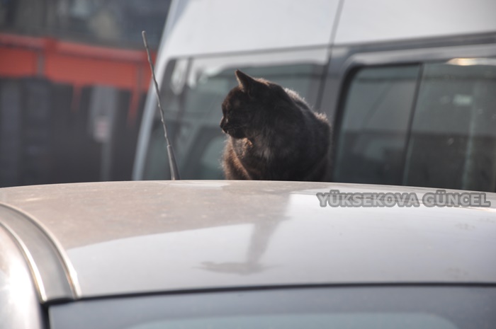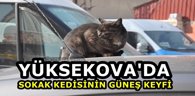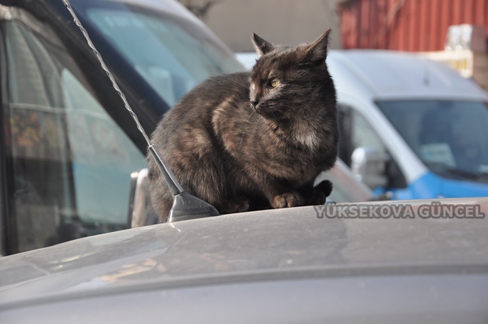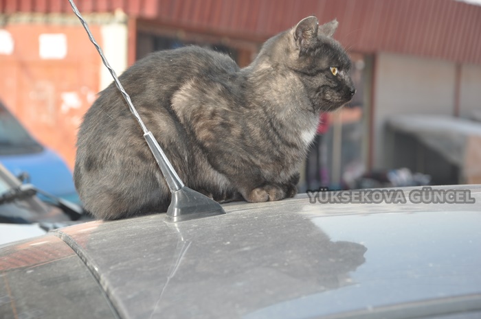 Yüksekova ilçesinde güneşin yüzünü göstermesini fırsat bilen bir kedi, çıktığı arabanın üzerinde ısınmaya çalıştı.