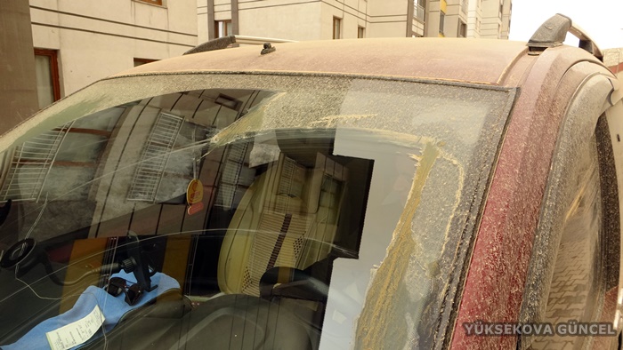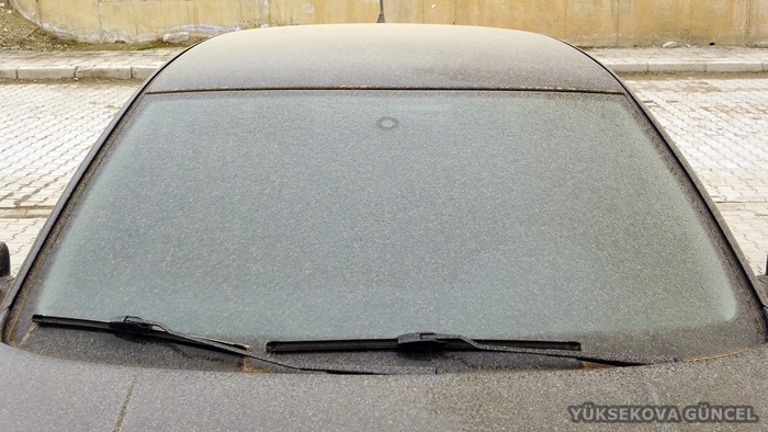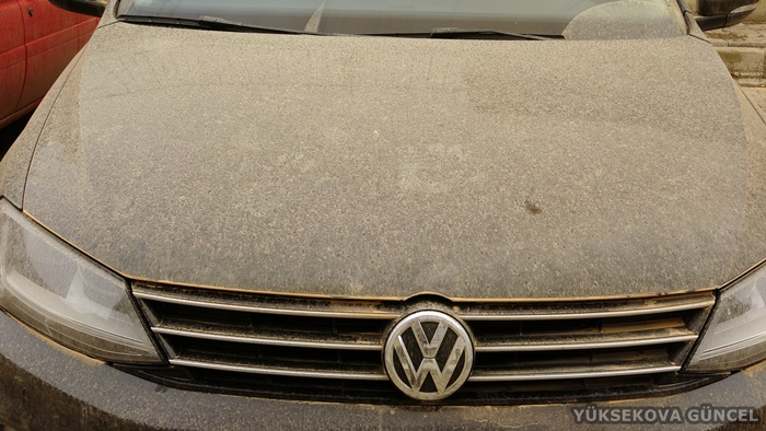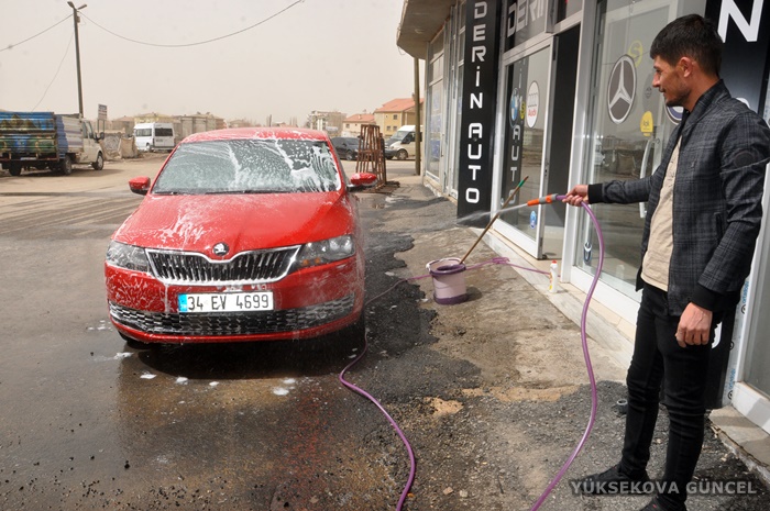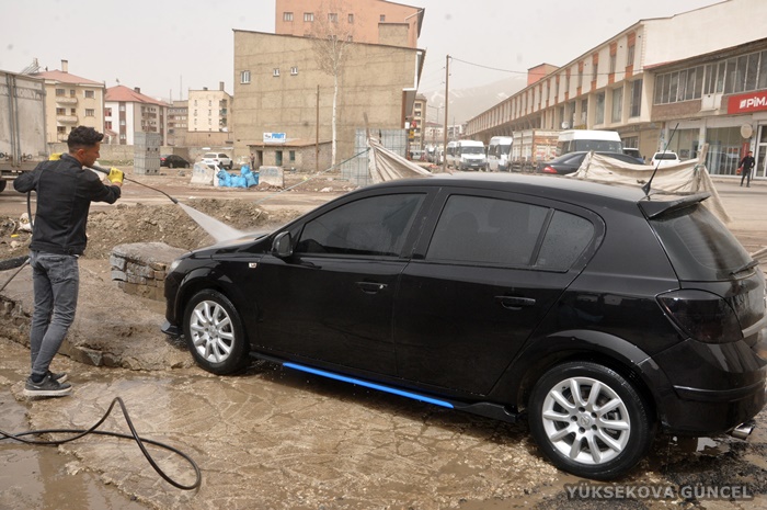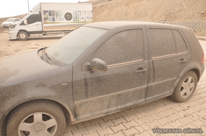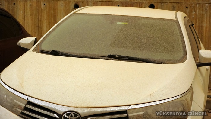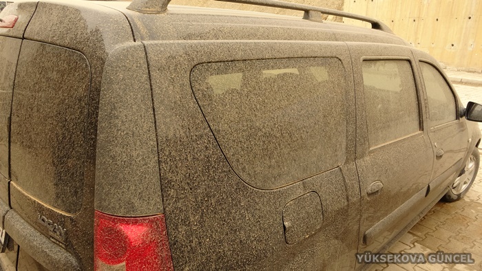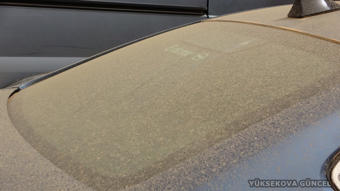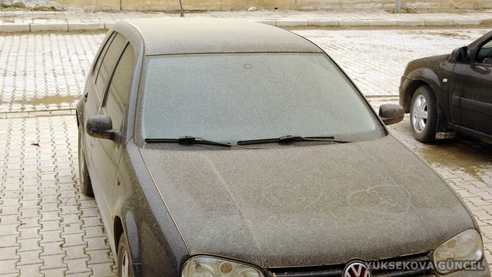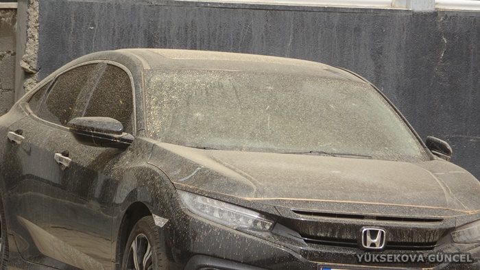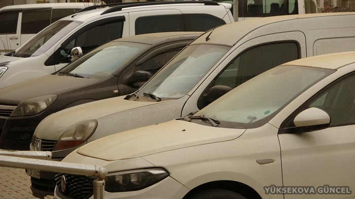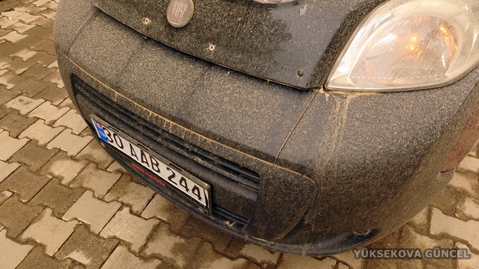 Kuvvetli rüzgar ve yağışların etkisiyle kalkan toz bulutları Yüksekova'da araçları çamura bürüdü.