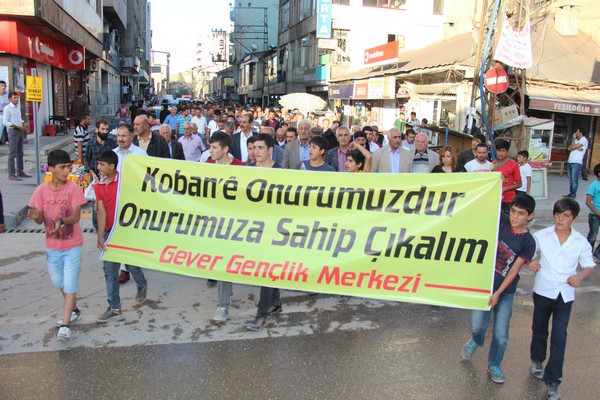 IŞİD'in protesto edilmesi için kalabalık, ilçe merkezinde bulunan DBP ilçe binası önünde toplandı. Aralarında DBP İlçe Başkanı Fikret Turgut, Belediye Başkan Vekili Reyhan Öner ve STK temsilcilerinin de bulunduğu kitle Eski Cezaevi Kavşağı'na buradan da ilçe merkezindeki Cengiz Topel Caddesi'ne kadar yürüdü. İlçe merkezinde ise basın açıklaması yapıldı.