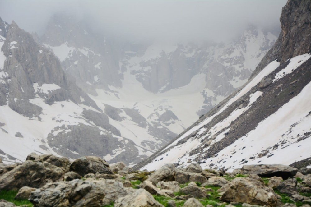 Mayıs ayının bitmesine sayılı günler kala dağları gezerek günün keyfini çıkaran dağcılar, karda kaymayı da ihmal etmedi.