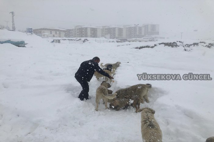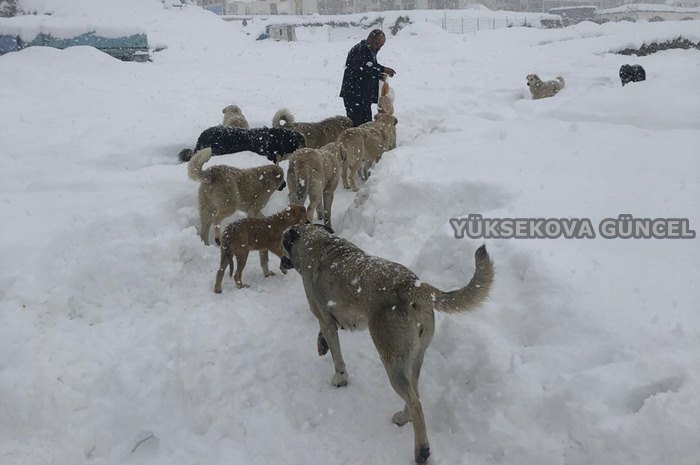 Yüksekova ilçesinde günlerdir yoğun kar yağışı nedeniyle aç kalan köpeklere Müslüm Taşçı adlı vatandaş ekmek ve sakatat dağıttı.