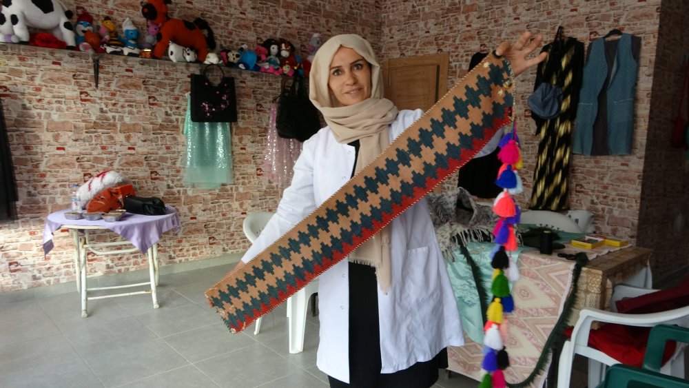 Kendi imkanlarıyla açtığı iş yerinde çok sayıda ürün çıkarttığını belirten Gülay Açıkel, “Kendi çabamla iş yerimi açtım. Bu iş yeri nakış üzerinedir. Geri dönüşümden çok sayıda ürün çıkıyor ve en önemlisi burada çeyizlikler de çıkartıyoruz. Kızlarımız ve kadınlarımız evde sıkılmasın diye burada dikiş ve nakış işlemlerini öğretiyorum. Biz yöresel ve normal elbiselerin yanında her şeyi yapıyoruz. Burada kimseden bir ücret almadan kurs şeklinde öğretiyorum. Burada amigo bebekler, çantalar ve kıyafetler çıkıyor. Biz burada 8 kişi yer alıyoruz ve bu 8 kişi yaptıkları ürünlerle de ev bütçelerine katkı sağlıyorlar. Kadın gücüyle kendi iş yerimizde örnek olmaya devam ediyoruz. İnşallah her kadın böyle örneklerle ayaklarının üzerinde durur. Kadınlarımız buraya geldiklerinde asla sıkılmıyorlar, çünkü ev ortamını aratmıyor ve sadece kadınlar yer aldığı için daha mutlular” dedi.