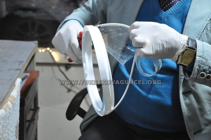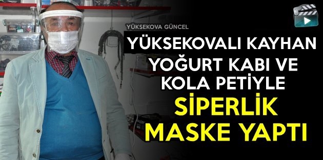 Yüksekova ilçesinde yaşayan Yunus Kayhan isimli vatandaş yoğurt kabı ve pet şişelerle siperlik maske yaptı.