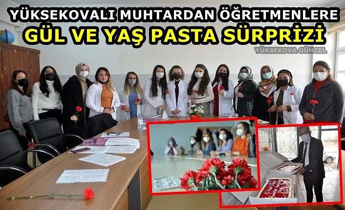 Yüksekova ilçesinin Çatma Köyü Muhtarı Metin Çakil, 8 Mart Dünya Kadınlar Günü nedeniyle ders başı yapan kadın öğretmenlere gül ve yaş pasta sürprizi yaptı.