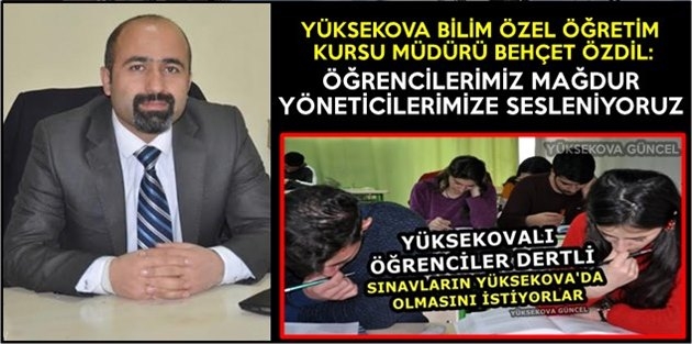 Öğrencilerimiz Mağdur Yöneticilerimize Sesleniyoruz Diyen, Yüksekova Bilim Özel Öğretim Kursu Müdürü Behçet Özdil,''YKS sınavı için Hakkari ve Van’a gitmek zorunda kalan öğrencilerimiz her zaman yaşadıkları yol barınma ekonomik sıkıntıları bu sefer corona virüs nedeni ile daha fazla yaşayacaklarını söyleyerek basta mülki amirimiz olan sayın kaymakamımıza, ilçe milli eğitim müdürümüze ve sivil toplum kuruluşlarımıza seslenerek YKS yerleri açıklanmadan önce sınavın okul, gözetmen ve en önemlisi güvenlik probleminin yaşanmadığı Yüksekova’da yapılması için her türlü girişimlerde bulunmalarını talep etmektedirler.’’İfadelerini kullandı.