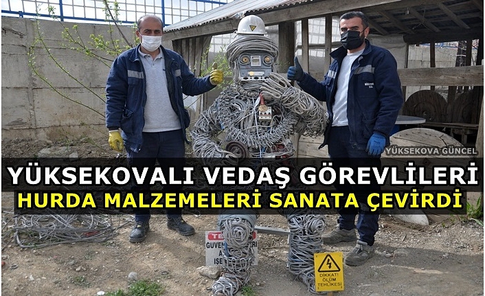 Yüksekova ilçendeki Vangölü Elektrik Dağıtım A.Ş. (VEDAŞ) arıza servisinde çalışan Sabri Akdoğan ve Fikret Öztunç, atık malzemeleri sanata dönüştürerek 'tel adam' yaptı.