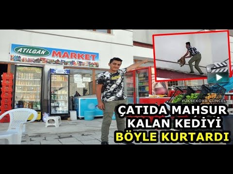 Hakkari’nin Yüksekova ilçesinde bir binanın çatısında mahsur kalan kediyi, Erdem Ercan adlı genç yüksekten korkmasına rağmen çatıya çıkarak kurtardı.