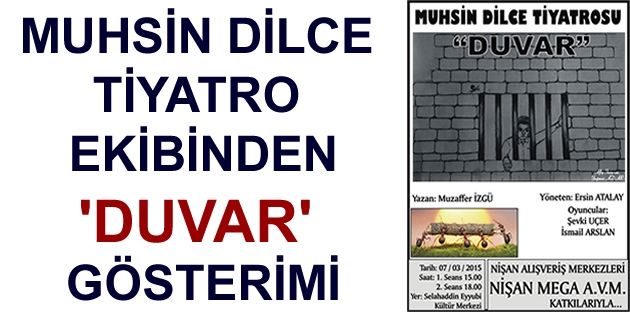 Yüksekova'da Muhsin Dilce Tiyatro Ekibi tarafından 'Duvar' adlı oyunu sergiliyor. Yüksekova Selahaddin Eyyübi Kültür Merkezinde yarın (Cumartesi) günü 2 seans şeklinde sergilenecek oyun için bilet bulamayan tiyatro severler biletleri Selahaddin Eyyübi Kültür Merkezi'nde temin edebilir.